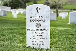 CITATION: The President of the United States of America, in the name of Congress, takes pleasure in presenting the Medal of Honor to Lieutenant Colonel (Infantry) William Joseph "Wild Bill" Donovan (ASN: 0-102383), United States Army, for extraordinary heroism on 14 and 15 October 1918, while serving as Commanding Officer, 165th Infantry, 42d Division, American Expeditionary Forces, in action at Landres-et-St. Georges, France. Lieutenant Colonel Donovan personally led the assaulting wave in an attack upon a very strongly organized position, and when our troops were suffering heavy casualties he encouraged all near him by his example, moving among his men in exposed positions, reorganizing decimated platoons, and accompanying them forward in attacks. When he was wounded in the leg by machine-gun bullets, he refused to be evacuated and continued with his unit until it withdrew to a less exposed position.[25]