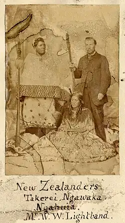 Lightband (right) with rangatira Takerei Ngawaka and Ngawaka's wife, Ngahuia, while in England in 1863 or 1864