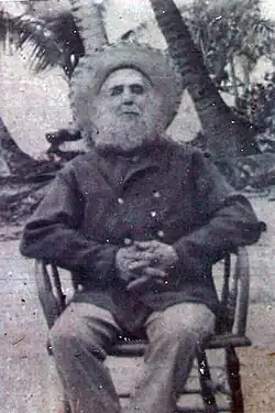 William Marsters was born Richard Masters in 1831. He came from Leicestershire, England, and arrived in the Pacific around 1856. He first settled in Penrhyn, the most Northern of the Cook Islands. He married the daughter of one of the chiefs on the Island and in 1862 they moved to Manuae and then to Palmerston on 8 July 1863 (or 1861 or 1864, according to different documents[1]). They were accompanied by his wife's cousin with whom he later had children. His task was to produce copra and collect bêche-de-mer for a Tahitian trader named Brander, but Brander never returned. Marsters decided to settle his family permanently on the island. He took up a third wife, and the descendants of these three Penrhyn women make up the present inhabitants of Palmerston.[2] Marsters died on 22 May 1899 at the age of 67 (although his headstone records his age as 78). He had 23 children and 134 grandchildren.[3]