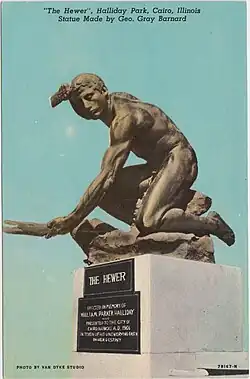 Halliday spent the last six months of his life residing in the Lexington Hotel in Chicago, Illinois. He had been battling an illness during his stay in Chicago and died from the condition.[63] At his death he was reputed to be worth from $3,000,000 to $4,000,000.[64] Based on inflation from 1899 to 2012, $4,000,000 is the money equivalent to approx $108,649,539 today. After Halliday's death in 1899, his estate left the Cairo Public Library $5,000, to be used to expand the collection of rare and fine edition books. Halliday had served as president of the library board.[65] In 1906, Halliday's daughter Mary presented the Hewer to the city of Cairo in honor of her father. The Hewer is a historic bronze nude by George Grey Barnard that was exhibited at the St. Louis World's Fair and was considered to be one of the two best nudes in the United States.[66]