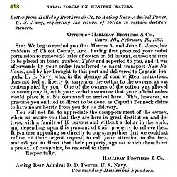 Records of the Union and Confederate Navies in the War of the Rebellion: Letter from Halliday Brothers & Co. to Acting Rear-Admiral Porter, U.S. Navy, requesting the return of cotton to certain destitute owners. Page 418 Series I Volume 24