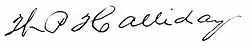 Halliday was born to Samuel Halliday and Eliza Parker in Ohio in 1827, the eldest of seven children.[1] His father, an immigrant from Scotland, had graduated from the University of Edinburgh at the age of 19 and immigrated to America in 1818 to receive a professorship at Ohio University. However, his travel was difficult, and he became stranded in the small village of Rutland, where he was convinced to stay and open a school. Eventually, Samuel surveyed and planned a town with William Parker, Halliday's grandfather.[2] Samuel held the position of county auditor in Meigs County, Ohio, for 25 years.[3]