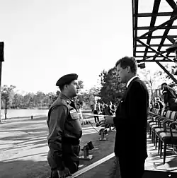 Then Brigadier General Yarborough meeting with President John F. Kennedy at Ft Bragg, October 12, 1961.