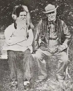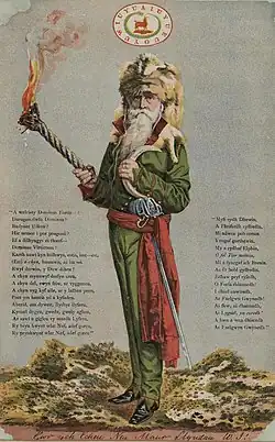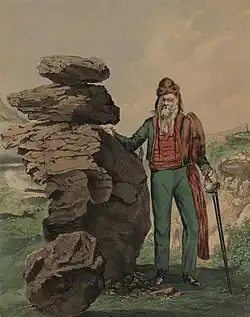 Soon returning to Wales, Price set himself up as a druid, founding a religious druidic group that attracted a number of followers. Little is known of the specific doctrines which he preached, but his followers walked around carrying staffs engraved with figures and letters. Declaring that marriage was wrong as it enslaved women, he began having a relationship with a woman named Ann Morgan, whom he moved in with, and in 1842 they had a daughter. He baptised this child himself at the Rocking Stone in Pontypridd, naming her Gwenhiolan Iarlles Morganwg (meaning 'Gwenhiolan, Countess of Glamorgan').[26] He began developing an appearance that was unconventional at the time, for instance wearing a fox fur hat (signifying his healing powers as a doctor) and emerald green clothing, as well as growing his beard long and not cutting his hair. He also began attempting to hold Druidic events, organising an eisteddfod at Pontypridd in 1844, but nobody turned up, and so, solitarily, he initiated his daughter as a bard at the event. In 1855 he then led a parade of the Ivorites, a friendly society that held to a philosophy of Welsh nationalism, through the streets of Merthyr Tydfil, accompanied by a half-naked man calling himself Myrddin (the Welsh name for Merlin) and a goat.[27]