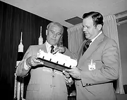 Dr. Wernher von Braun, a former Marshall Space Flight Center Director, and Lucas, a newly appointed MSFC Director, viewing a Space Shuttle model, October 11, 1974.