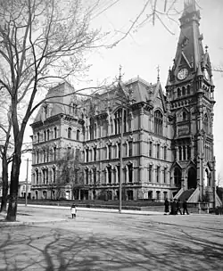 Portland High school was "Transition or Semi-Norman" in style, and measured 200 feet deep by 140 feet wide, featuring a four-story atrium with a skylight.[6] The architect was instructed that there was no money to be spent on ornaments which were non-essential to construction, and that beauty would instead have to be sought in lines of form framed in bricks and mortar.[7] The building was initially projected to cost $40,000, final cost exceeding $123,385.85.[8] The building required repairs within its first decade, and the roof around the skylight had begun to sag. Stokes responded that the School Board had been overzealous and that green lumber used in construction had suffered shrinkage.[9] The Girls' Polytechnic School later used the building until 1928.[9]