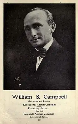 Campbell, originally from Ashley, Pennsylvania,[1][2] began his career working with animals when he ran away with a circus.[3] His transition to the film business began when opened a movie theater,[4] and then connected with Selig in 1908,[5] for whom he wrote scenarios (today called screenplays).[4] One memorable title for Selig was How the Cause Was Won, which was said to be "the first two-reel military drama ever produced."[2] Campbell next worked for Keystone and Sunshine studios,[4] and then was hired as a writer and director for Mack Sennett.[5] His work for Sennett studios included directing the Sheriff Nell comedies.[6] His animal picture work including "lions for Fox,"[5] and "monkey comedies" for Universal starring Joe Martin the orangutan.[7] He directed a feature-length comedy for Universal starring Joe Martin and vaudeville performer Harry Burns called Loose Lions and Fast Husbands.[8] It was inexplicably never released, at least under that title.[7] Campbell also produced and directed the Snooky the Human-zee series of chimpanzee comedies for Chester Comedies.[5][9] In 1922 it was reported that he had directed "nearly all the famous monkeys that have appeared in motion pictures the past six years."[3] On more than one occasion, Campbell used live musicians to encourage his ape performers to evince on-screen emotion.[10] While filming a Snooky film, a string sextet performing Mendelssohn's Spring Song yielded an suitable chimpanzee facial expression suggestive of pathos; this was said to "prove that animals can be affected by melody as well as human beings."[11]