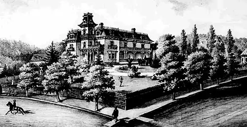 The house was later enlarged with an extended wing and another floor added with mansard roofs in the Second Empire style with these later additions made by architect William P. Lewis.[19] The back of the house faced what is today SW Broadway and its large two-story circular peaked greenhouse was located at the corner of Broadway and Jefferson.[20]