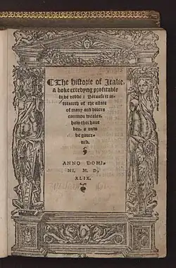 During the summer of 1549 Thomas appears to have returned to England "highly fam'd for his travels through France and Italy", and bringing home with him another work, the result of his Italian studies, which was also published by Berthelet under the title The Historie of Italie ... (1549). This work was dedicated, under the date of 20 September 1549, to John Dudley, Earl of Warwick. It is believed to have been suppressed and publicly burnt, probably after Thomas's execution,[11] yet it was twice reprinted by Thomas Marshe, in 1561 and (with cuts) in 1562.[12]