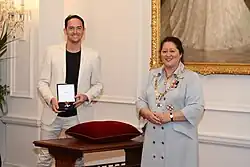 Trubridge (left), after his investiture as a Member of the New Zealand Order of Merit by the governor-general, Dame Cindy Kiro, at Government House, Wellington, on 10 December 2021