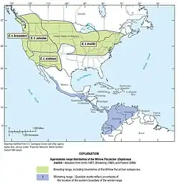 The subspecies are best distinguished from each other by their songs. In addition, the four subspecies have significant genetic differences based on mitochondrial DNA analysis.[2] Their winter ranges have been elucidated using mitochondrial DNA genetic studies of 172 birds sampled in winter combined with plumage coloration and morphological differences.