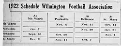 From 1922 to 1924, another league based in Wilmington, Delaware operated under the "Wilmington Football Association" name. Teams in 1922 included the Seventh Ward Chicks, Parkside, Defiance Academy Bulldogs,[a] and the St. Mary's Cats.[3] Ben Greenstein, editor for The Evening Journal, was named president.[4] Defiance clinched the 1922 championship by winning 78–0 against Seventh Ward.[5] Seventh Ward left in the second season, bringing the league down to three teams. They set up a six-game schedule, with Defiance winning out again.[6] In a meeting held on September 16, 1924, seven teams planned to join and Ed Fegley replaced Ben Greenstein as league president.[7] Teams who planned to join on September 16 included, the Shamrock A.C.,[b] Eleventh Ward, Ninth Ward, the Defiance Academy Bulldogs, the South Side-Eden Snappers, Hillside, and the Rockford Yellow Jackets. The Yellow Jackets did not join and were replaced by Parkside; they soon after left and were replaced by the "Hibernians".
