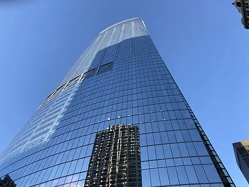 Wilshire Grand Center is a 1,100-foot (335.3 m) skyscraper in the financial district of downtown Los Angeles, California, occupying the entire city block between Wilshire Boulevard and 7th, Figueroa, and Francisco streets. Completed in 2017, it is the tallest building (if including the spire) in the United States west of Chicago. Though the structural top (in this case, the 300-ft spire) of the Wilshire Grand surpasses L.A.'s U.S. Bank Tower by 82 ft (25 m) and the Salesforce Tower in San Francisco by 30 ft (9.1 m), the roofs of both the U.S. Bank Tower and the Salesforce Tower are higher than the roof of the Wilshire Grand.[9] The Skyscraper Center lists the Wilshire Grand Center as the 15th-tallest building in the U.S. and the 95th-tallest in the world. It won the Structural Engineering Award 2019 Award of Excellence from the Council on Tall Buildings and Urban Habitat.[10]