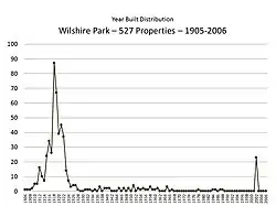 The first recorded residence in Wilshire Park was built in 1908. The transitional Prairie School style home (right) is an example of the work of architect Lloyd Wright. The neighborhood also features a 1938 apartment complex by the only female architect in Los Angeles at the time, by Edith Mortensen Northman.[7] Most of Wilshire Park was fully built out by 1926. The graph shows the pattern of development.
