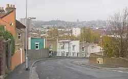 The view looking north from Alfred Road, Windmill Hill, Bedminster in Bristol. Prominent on the horizon are Cabot Tower and the Wills Tower of Bristol University.