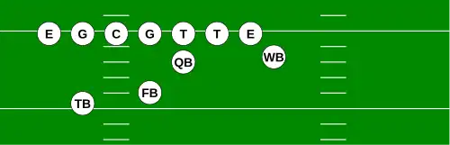 A wingback or flexback lines up off the line of scrimmage, generally a step behind, and outside of, a tight end.[1][2] It is a versatile position, as the wingback may be called upon to block, take a handoff, or run downfield for a pass.[1] An example of a formation that uses a wingback is the single-wing.