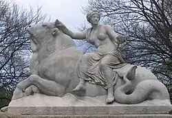 • The right sculpture features an Amazon seated on a fish-tailed water bull rising from the water. She extends a bowl of water toward the viewer, symbolizing the fertile and life-giving potential of water once it has been tamed and channeled for human use.