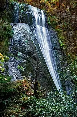 Wolf Creek Falls totals 125 ft (38 m) fall in two wide cascades and is the centerpiece attraction of the Wolf Creek Falls trailhead and Recreation Site.[1] A foot trail loops out and back for a total of approximately 2.3 mi (3.7 km) starting near Glide, Oregon. The first mile of the trail is wheelchair accessible with view points of the dense conifer forests.[2]