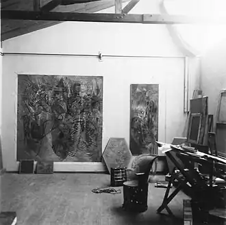 Together with Marcel Duchamp, Man Ray and Salvador Dalí, Paalen was among those responsible for the design of the 1938 International Exhibition of Surrealism at the Palais des Beaux Arts in Paris, where he produced a floor, with dead leaves and mud from the Montparnasse Cemetery, and an installation named Avant La Mare, consisting of an artificial pond with water, real water-lilies and reeds, beneath Duchamp's ceiling of empty coal sacks. The doll Paalen decorated came with a silk scarf, a giant bat on her head and an eerie, mushroom-covered leaf-dress. It anticipated the barely visible, floating, gliding totemic fairy creatures from his oil paintings with fumage that Pierre Colle would show the following June in his surrealist gallery. He also participated in the editorial of the catalogue, published as Dictionnaire abrégé du Surrealisme to the show, in which his most famous object, Nuage articulé, was discreetly announced as a drawing. Recent research suggests that Paalen had a huge influence on the design of the exhibition's Great Hall. Other critics suggest that the entire installation was meant to imply the minatorial situation of the Surrealist group itself, reflected by the approaching war, as well as a huge mother's womb as vade mecum to fight the causes of the crisis, which were located in the paternalistic fixations of the whole epoch.[8] Paalen's biographer Andreas Neufert, in particular, suggests the latter reading and sees the installation as a symptom of an ideological shift within Surrealism, away from Freud's rigid theory of the Oedipus complex to ideas centred on Otto Rank's theory The Trauma of Birth, with its recognition of the emotional nature of the child and its ties to the mother. This latter theory was represented and defended exclusively by Paalen and his wife Alice Rahon in this period.[9]