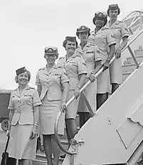 The first WAFs wore men's uniforms with neckties.[8] Geraldine Pratt May quickly ordered women's uniforms, selecting herself the particular shade of blue. The cut of the winter uniform was modeled after those of airline flight attendants, using the same material as the men's winter uniforms. Instead of a necktie, tabs were worn on the collar. The effect was considered "smart and contemporary",[8] The two-piece summer uniform, however, made of cotton-cord seersucker, fit poorly and required frequent ironing.[8]