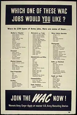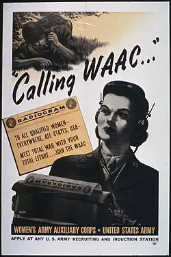 The Women's Army Corps (WAC; /wæk/) was the women's branch of the United States Army. It was created as an auxiliary unit, the Women's Army Auxiliary Corps (WAAC), on 15 May 1942, and converted to an active duty status in the Army of the United States as the WAC on 1 July 1943. Its first director was Colonel Oveta Culp Hobby.[1][2] The WAC was disbanded on 20 October 1978, and all WAC units were integrated with male units.
