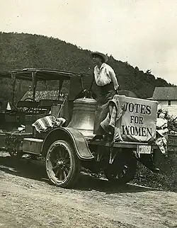 Katharine Wentworth Ruschenberger, collaborating with the PWSA, bought a "Justice Bell" that would not ring until women won the vote.[47][48] The bell was part of the campaign leading up to the vote.[47] The tour began in Sayre on June 23, 1915.[49] Ruschenberger purchased a truck where she could mount the Justice Bell and show it around the state.[50] The first stop attracted a large crowd who listened to Ruschenberger and others speak.[49] On July 5, Roessing drove the Justice Bell truck to Schenley Park where a rally was taking place for Americanization Day and she and other suffragists "crashed" the event.[51] Children, professionals, immigrants, and grandmothers participated and demanded the right for women to vote in Schenley Park.[51] The Justice Bell traveled a total of 3,935 miles, around 50 miles a day.[52][45]