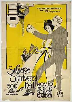 In July 1916, more than 800 women rallied at the home of Alice Kiernan to celebrate the dedication of a Pennsylvania suffrage flag and the inclusion of women's suffrage in political party planks.[60][61] Winifred Barron Meek Morris organized the Shirtwaist Ball in 1916 to raise money for women's suffrage.[55] The ball was held at Motor Square Garden and around 3,000 people of all social classes attended the ball.[62][55]