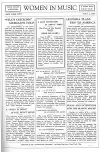 Major print media, including music journals, general magazines, and newspapers have cited Women in Music as a primary source for opinions, facts, and quotes. Some of the newspapers include The New York Times; The New York Sun; New York World-Telegram; New York Daily News; New York Post; The Baltimore Sun; Chicago Tribune; San Diego Union; Los Angeles Times; Press-Telegram; The Philadelphia Inquirer, and publications that drew articles from Everybody's Weekly syndication.[4]