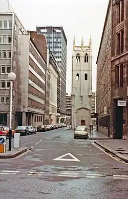St Alban, Wood Street was a church in the street, dedicated to Saint Alban. The church was of medieval origin, rebuilt in 1634 and then destroyed in the Great Fire of London in 1666.[3] It was then rebuilt in a Gothic design by Sir Christopher Wren.[4] However, it was severely damaged by bombing during the Second World War and the ruins cleared, leaving only the tower still present.[5]