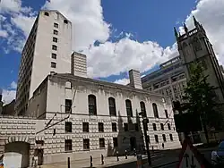 Tower of St Alban, Wood Street,[1] seen from the south; the former City of London Police HQ is to the right.