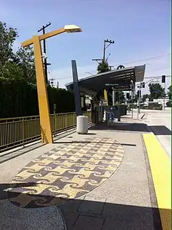 The terrazzo paving areas and porcelain enamel steel fence panels at this station are called "Journey to California" by Daniel Marlos. They resemble quilt designs that are centuries old and have descriptive names that correspond to important events. ‘Road to California’, ‘Railroad Crossing’, ‘Wandering Paths’, and ‘Wagon Wheel’ are just a few that actually deal with transportation. The selected pattern, Journey to California, is a pattern that references both California and travel.[6]