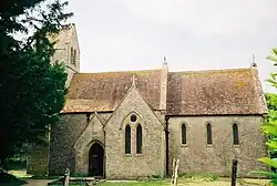 The Church of England parish church of St John the Baptist was 13th-century, but was largely rebuilt in 1862–63 to designs by the Gothic Revival architect Thomas Henry Wyatt. Remnants of the 13th-century church include the lower part of the west tower and an Early English Gothic lancet on the south side of the nave west of the south porch.[6] The parish is part of the Benefice of Moreton, Woodsford and Crossways with Tincleton.[7]