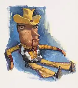 Woody was inspired by a Casper the Friendly Ghost doll that Lasseter had when he was a kid and the puppets from the children's television show Howdy Doody.[8][1] They based his facial features on Disney animator Tone Thyne.[9] Woody stayed a ventriloquist's dummy with a pull-string (hence the name Woody), until his character designer, Bud Luckey, suggested that Woody could be changed to a cowboy ventriloquist dummy.[10] Lasseter liked the difference between the western and the science fiction genres, so Woody was instantly changed. Eventually, all the ventriloquist dummy features of Woody were deleted as the dummy looked "sneaky and mean".[11] However, they kept the name Woody in homage to the Western actor Woody Strode.[12][13] In August 2009, Lee Unkrich, Toy Story 3 director, stated on his Twitter feed that Woody's last name is Pride and has been since earliest days of development.[14][15]
