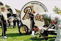 The drum is handled by a crew of six or seven, who are selected for their strength and agility. They painstakingly rehearse every movement of the drum to assure its being in the right place at the right time in accordance with the precise timing necessary for the fast-paced shows presented by the All-American Band.