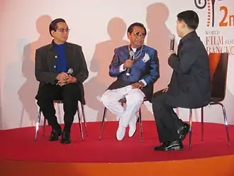 Thai actor Sombat Metanee and actor-director Dokdin Kanyamarn are interviewed during "Thai Night" festivities at the World Film Festival of Bangkok. Dokdin's 1970s musical comedy, Ai Tui, starring Sombat and Petchara Chaowarat was screened that night.