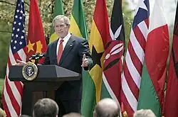 April 25 was designated as Malaria Awareness Day in 2007 by President George W. Bush, who called on Americans to join in on the goal to eradicate malaria on the African continent.[32] President Bush described it as a day when "we focus our attention on all who suffer from this terrible disease -- especially the millions on the continent of Africa. We remember the millions more who died from this entirely preventable and treatable disease." President Bush shared the White House's strategic plan against malaria, which included endeavors to distribute bed nets with the New York-based nonprofit group Malaria No More.[33]