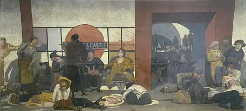 The Royal Academy Summer Exhibition of 1915 was noted for the paucity and general poor quality of paintings on war themes, but The Fighting-Line from Ypres to the Sea by W. L. Wyllie was noted for its bold experimentation in showing a bird's-eye view of war from an aeroplane. George Clausen's symbolist allegory Renaissance was the most memorable painting of that 1915 exhibition, contrasting ruins and oppression with dignity and optimism.[13] When exhibited in the spring of 1916, Eric Kennington's portrayal of exhausted soldiers The Kensingtons at Laventie caused a sensation.[14] Painted in reverse on glass, the painting was widely praised for its technical virtuosity, iconic colour scheme, and its ‘stately presentation of human endurance, of the quiet heroism of the rank and file’.[15] Kennington returned to the front in 1917 as an official war artist.