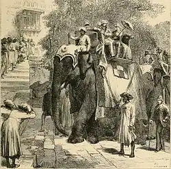 Grant's touring party arrived in Bombay on February 13, traveling for a month exploring India, meeting with a number of hosting British colonial officials, and the Maharaja of Jeypore.[86] Riding atop an elephant, the Grants, accompanied by Fred Grant and Adam Borie, made their way to the Taj Mahal. Young described the building as the most beautiful in the world.[87] Julia remarked that the structure was very beautiful, but not as much as the U.S. Capitol building.[88] Grant initially viewed British rule in India as "purely selfish", yet upon observation, he began to perceive that Indian colonial subjects were allowed to prosper.[89] However, he took exception to some social issues of India, especially concerning the rights and dignity of women.[90] Overall, however, Grant and his party maintained a critical attitude towards European colonialism and imperialism.[91][f] In Calcutta, Grant met with the Viceroy of India Lord Lytton, whom Grant informed that he was an admirer of his father's poetry, while Lytton told Grant he had studied and respected Grant's career.[93][g]