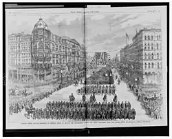 Faced with idle retirement, Grant sought to fill the void in his post-presidential life and decided to embark on a world tour with his wife, Julia – an idea he had often entertained for some years. He would use the money he had earned from his investment to pay for the tour. During the week before he departed on his tour he arrived at Philadelphia on May 9, and stayed in the home of his close friend, George Childs.[5] On the 14th a reception for Grant was given at the Union League Club, which concluded with a review of the First Regiment Infantry of the National Guard of Pennsylvania.[6]