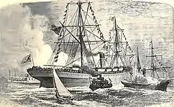 During his stay in Japan, a plot to assassinate Grant and the Emperor by Japanese hardliners was revealed but nothing ever became of the conspiracy.[105] Regardless, Japan, Grant's last visit abroad, proved to be his favorite country on the tour.[106][107] Before departing Consul-General Van Buren delivered a farewell speech for Grant. The Grants boarded the SS City of Tokyo and departed Yokohama Bay bound for San Francisco. As they sailed out of the harbor, various naval escorts fired their guns in salute. A Japanese man-of-war escorted the Grant touring party as far as the Inland Sea, also firing her guns in salute, before the City of Tokyo headed out to open sea. Young later wrote that they felt as though they were saying farewell to friends.[108]