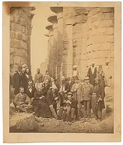 The Grants spent Christmas 1877 aboard the warship Vandalia, docked in Palermo, Italy.[42] The ship served to emphasize Grant's political importance while he was representing the United States, which was still emerging as a world power.[43] After cruising the Mediterranean, the Grants took a winter sojourn through Egypt and the Holy Land arriving in Alexandria on January 5, 1878.[44] The Khedive of Egypt, Ismail the Magnificent, allowed Grant to stay at his palace and provided a steamship to travel up the Nile River.[43] During his journey up the Nile he visited the towering minarets of Cairo and the ruins of the Karnak Temple complex in Thebes, the ancient Egyptian city.[45] Egyptian villagers welcomed Grant as "the King of America".[46] Grant's energy seemed to be endless as he explored the ancient tombs and temples.[43] He said that his weeks traveling up the Nile were "among the happiest in my life".[47] Grant, however, was critical of the filthy condition of Alexandria's poor and noted an innate "ugliness, slovenliness, filth and indolence".[44]