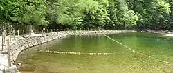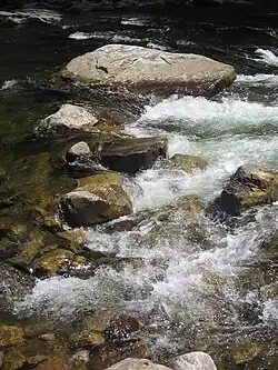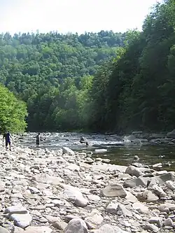 Edward Gertler, author of Keystone Canoeing, writes that Loyalsock Creek's "exciting whitewater, above Forksville, has long been a favorite of paddlers who are quick and tolerant enough to endure its fickle water levels and weather".[74] This is the stretch of the creek in and near the park, whose "long, steepening, and complex boulder patch and ledgy rapids demand your attention ... A boater's chute through the middle of the swimming area dam at Worlds End State Park climaxes this run".[74]