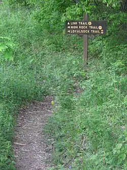 • Link Trail is a moderate 8.5-mile (13.7 km) trail marked with a red X on a yellow circle blaze. The trail starts at the Cabin Bridge in the park and follows Loyalsock Creek before it branches off and follows Double Run. The trail then ascends to Canyon Vista and heads out into Loyalsock State Forest where it links up with the Loyalsock Trail at the 55.33-mile (89.05 km) post.[17] The Loyalsock Trail can be followed back for a 17.62 miles (28.36 km) long loop.[71]