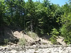 In 2004, the Loyalsock Creek Watershed Association installed a fence on the creek's banks near the cabins to limit pedestrian access and erosion. The association planted shrubs and trees in the same area to stabilize the creek's banks in 2008, and in September 2010 replaced more than 1,500 feet (460 m) of fence with a less visible version.[37][38] On January 25, 2010, flooding caused by heavy rain and melt from 20 inches (510 mm) of snow "washed out a bridge" leading to the cabin area and destroyed 86 feet (26 m) of road there,[39] leaving the park looking like "the set of disaster movie".[40] The cabin area road needed $72,120 in repairs, the park was not fully restored until Memorial Day.[40][41] Two floods hit the park in 2011, the first from Hurricane Irene on August 29, and the second from Tropical Storm Lee on September 8. Lee washed away about 20 to 22 short tons (18 to 20 t) of gravel used to make emergency repairs to roads in the park from Irene damage. Loyalsock Creek reached 20.4 feet (6.2 m) south of the park, and campers in the park had to be evacuated.[39] Worlds End and Promised Land State Park had "significant damage to roads and bridges", damage to Loylasock State Forest roads was also heavy, and the DCNR estimated the two storms caused $3 to $4 million of damage to its forests and parks.[42] Worlds End was closed for two weeks after the Lee flood.[43]