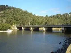 The Woronora Bridge was built to eliminate the steep descents and ascents for traffic between Sutherland and Menai. The bridge is approximately 600 metres long and was completed in 2001 as an alternative to the Old Woronora Bridge. There is a public path located just underneath the road on the bridge shared between bicycle and pedestrians. The path can be accessed from Menai Road on the Bangor side and Prince Edward Park Road or River Road on the Sutherland side.
