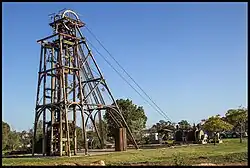 On the eastern edge of the village, toward its southern end, was the Occidental Gold Mine (later the New Occidental Gold Mine),[2][3] and to the village's north-east, the Chesney Mine.[4] Less well known mines in the area were the Gladstone Mine (a copper mine, opened c.1909),[5] in the north-west of the village,[6] Mount Pleasant Mine, just east of the village,[7] and the Young Australian Mine, also just east of the village but a little further south.[8] The irregular shape of the village's ground plan was defined, in a large part, by the presence of these five mine sites, which constrained where the village could be located.[2][9]