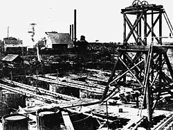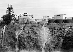 The Cobar area is most commonly associated with copper mining, but a line of mines, which were primarily for gold, stretch way from the town to its south, from Fort Bourke Hill to as far as just beyond a landform known as 'The Peak'.[12] Although it would later become a copper mine, the first of these gold mines was the Chesney Mine, opened in 1887.[4][13] The Occidental Mine was working by mid-1889.[14] These gold mines gave rise to Wrightville and its neighbouring village Dapville,[15] which seems to have been largely a suburb of Wrightville.