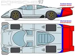 1969 Porsche 917 versions illustrate Kamm's principle: with long tail (red) or truncated (blue), both offering low drag, but not enough downforce for racing success