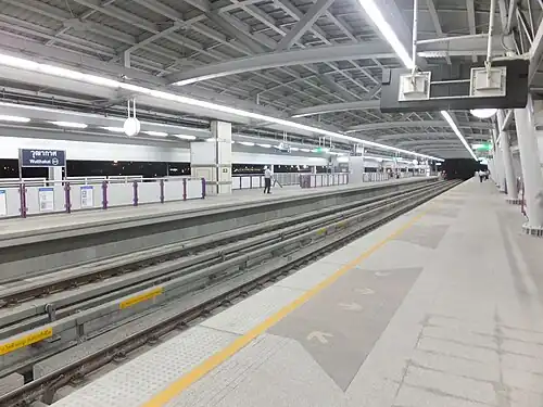 Wutthakat BTS station (Thai: สถานีวุฒากาศ, pronounced [sā.tʰǎː.nīː wút.tʰāː.kàːt]) is a BTS skytrain station, on the Silom Line at the Thon Buri and Chom Thong District boundary, Bangkok, Thailand. The station is located on Ratchaphruek Road over the Khlong Dan canal. It is surrounded by residential buildings, small shops and office towers. The station opened on 5 December 2013.[1]