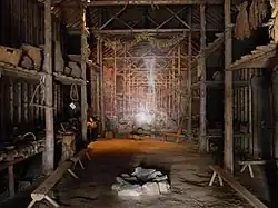 Historically, the Huron have lived in villages spanning from one to ten acres (40,000 m2), most of which were strongly fortified and enclosed by high and strong palisades of wood in double and sometimes triple rows for defense against enemy attack. They have also lived in longhouses covered with tree bark similar to other Iroquoian cultural groups, which could house twenty or more families in one dwelling, and were in different lengths, some being thirty or forty feet in length. A typical village or town historically had 900 to 1,600 people organized into 30 or 40 longhouses.[22] Villages were moved about every ten years as the soil became less fertile and the nearby forest – from which they took firewood – grew thin.[61] The Huron engaged in trade with neighboring nations, notably for tobacco with the neighboring Petun and Neutral nations.[62]
